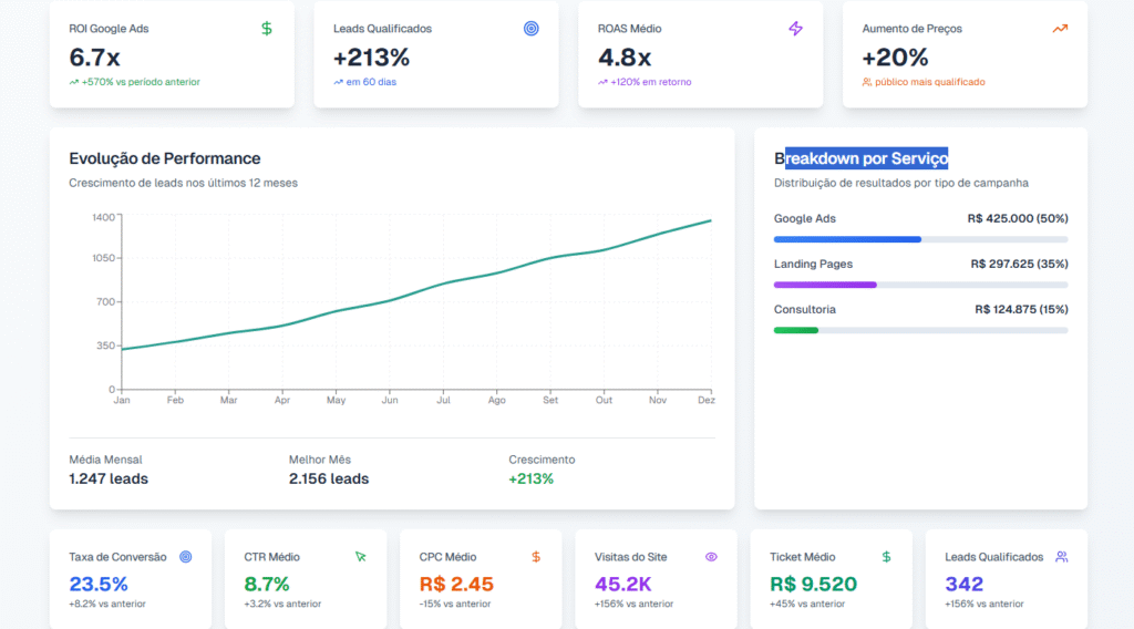 Transparência Radical: Dashboards em tempo real e relatórios objetivos. Você sabe exatamente o que está funcionando (e o que não está).